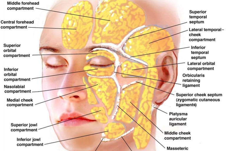 o Orbital fat: Surrounds the eyes, providing support and contributing to the appearance of youthful eyes.